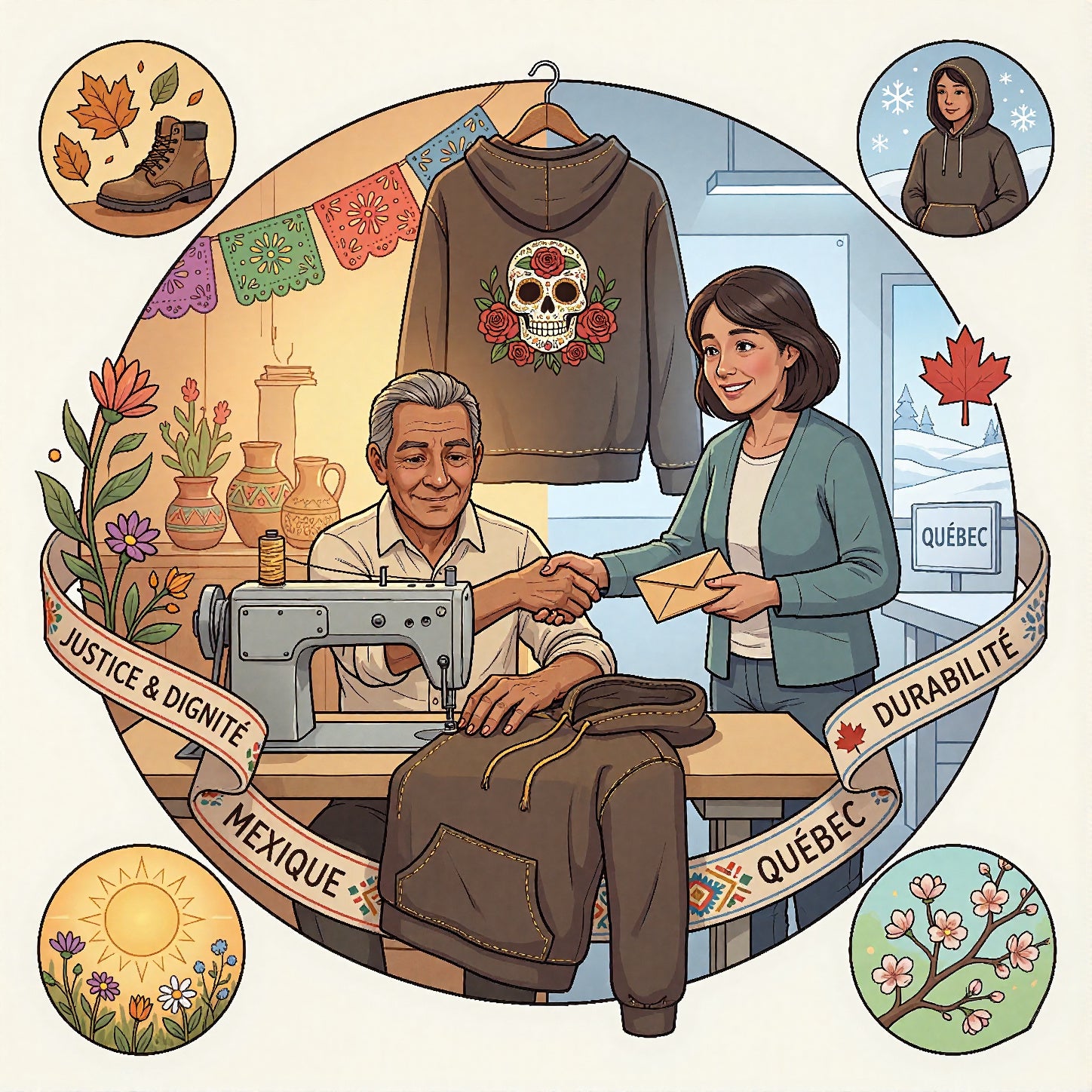En leur offrant un salaire juste et des conditions dignes, nous honorons la valeur de leur travail et la noblesse de leurs gestes. Nos créations sont faites pour durer, traverser les saisons et accompagner les histoires de ceux qui les portent. Elles unissent la force du Mexique et la douceur du Québec, entre tradition et liberté. Chez Chokani, la mode devient un pont entre les mondes — une célébration vivante du courage, de la beauté et de la main humaine.