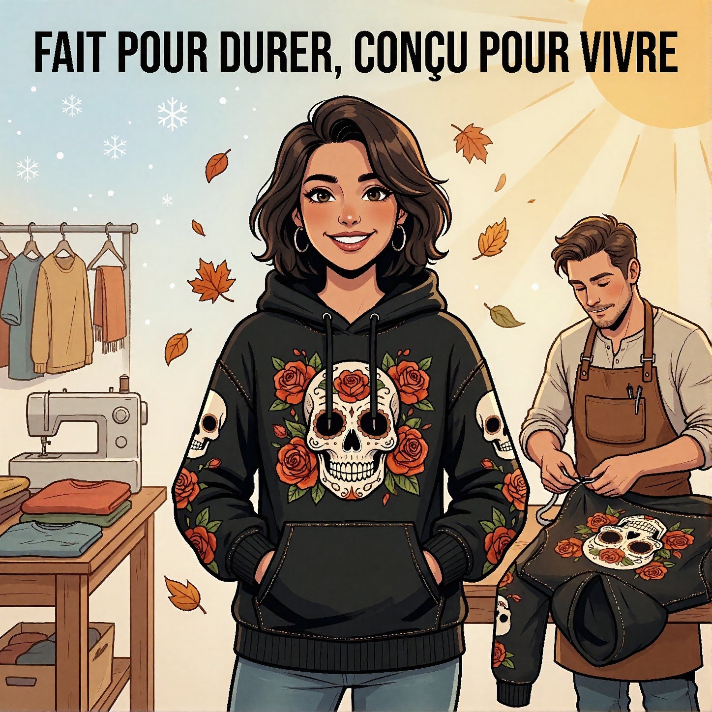 Le rock ne vieillit pas: il se transforme. Les crânes, les roses et les symboles de liberté défient le temps, génération après génération. Ils traversent les modes sans jamais perdre leur force, leur audace ni leur mystère. Nos créations incarnent cet esprit éternel : des vêtements faits pour durer, évoluer, s’imprégner de ton histoire. Chaque couture, chaque détail porte la marque du vécu, de la passion et de l’attitude. Parce que le style change, mais l’âme rebelle, elle, ne meurt jamais.