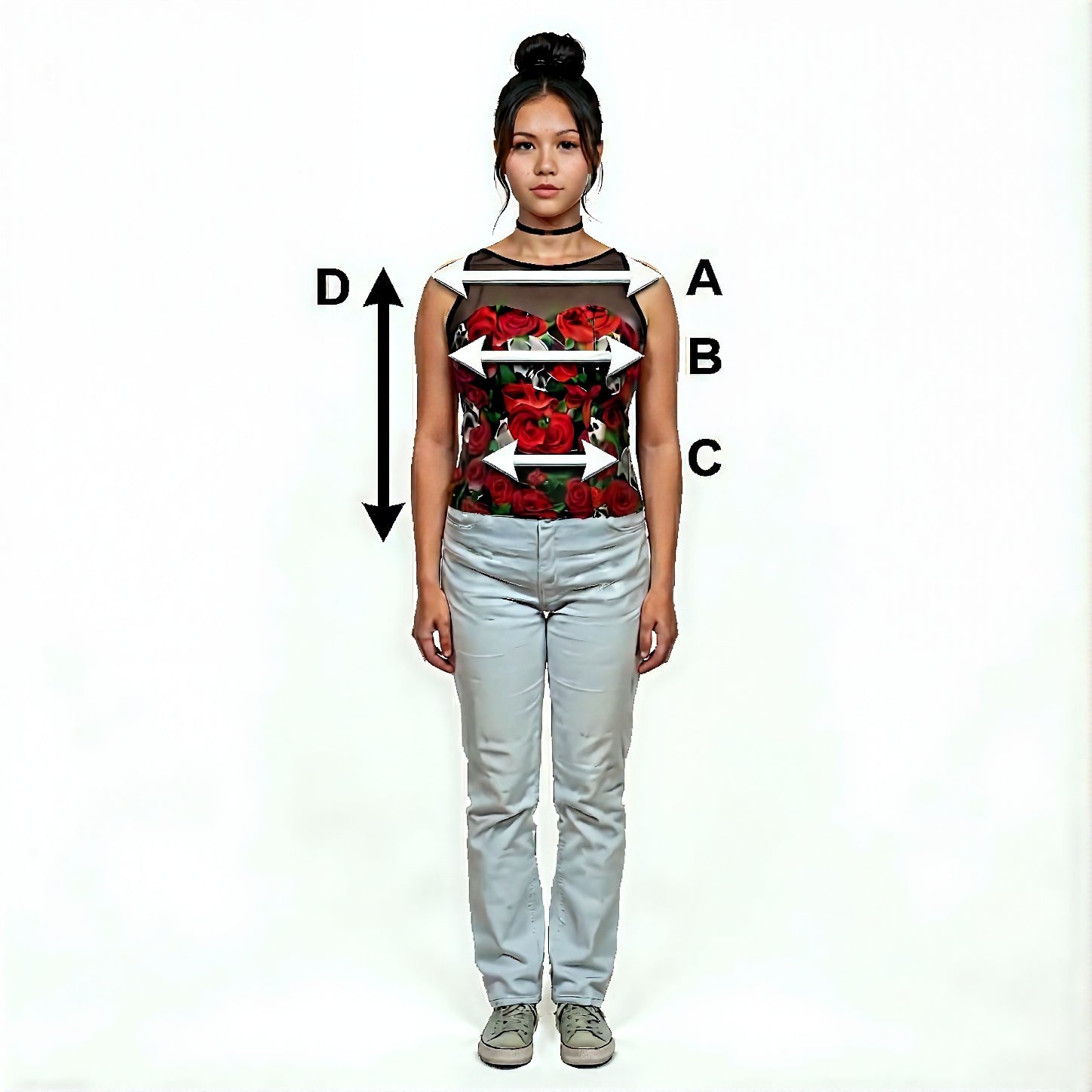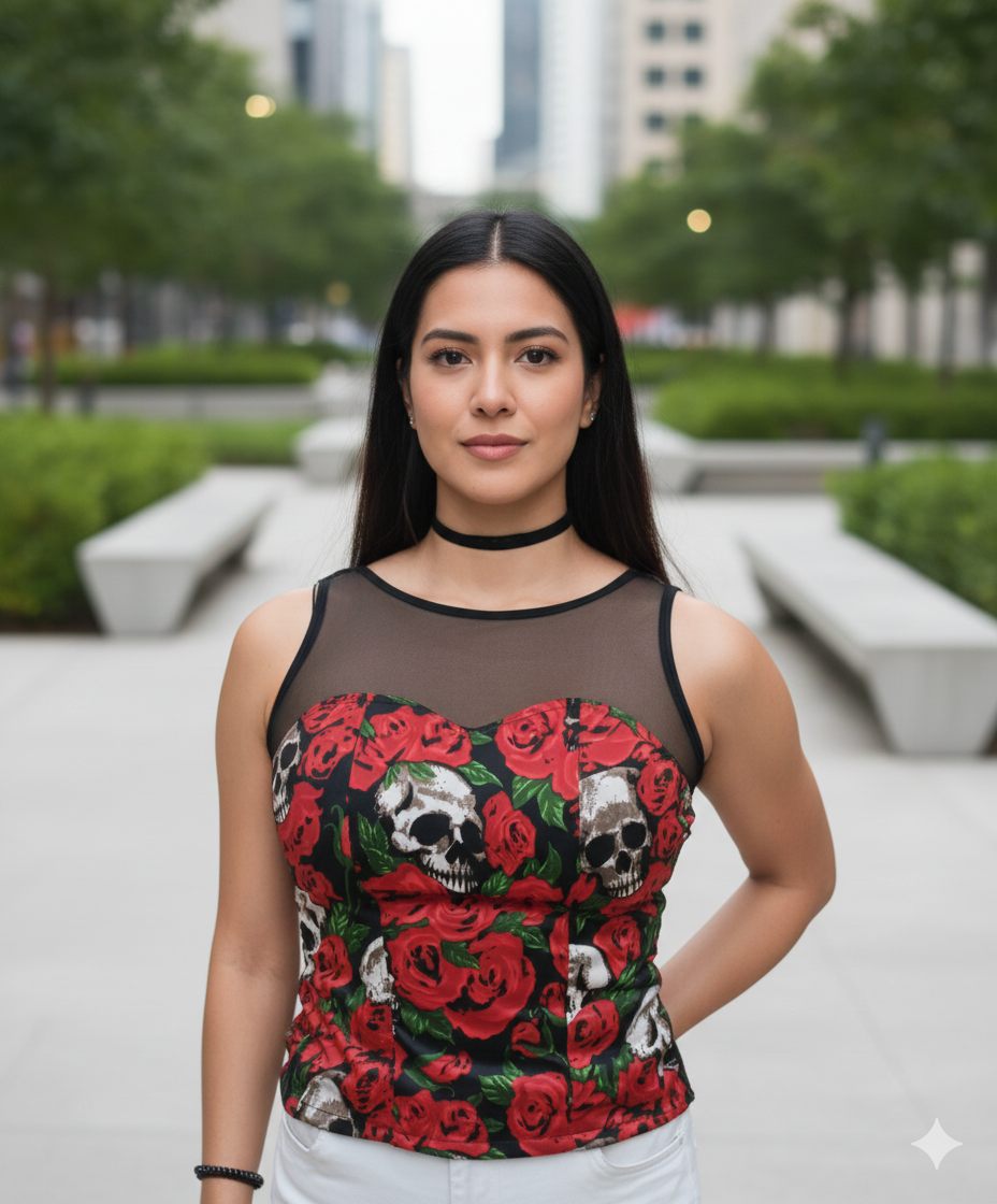 Exprimez votre style unique avec ce haut gothique à résille 🌹💀, mélange parfait d’audace et d’élégance sombre. Le tissu imprimé de crânes et de roses rouges se marie à un col en résille transparente qui ajoute une touche sexy et mystérieuse.