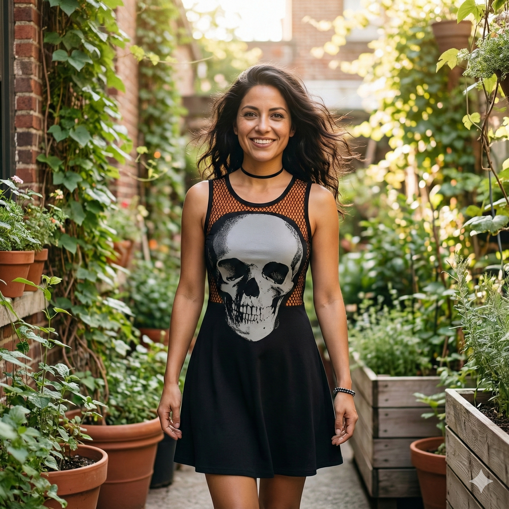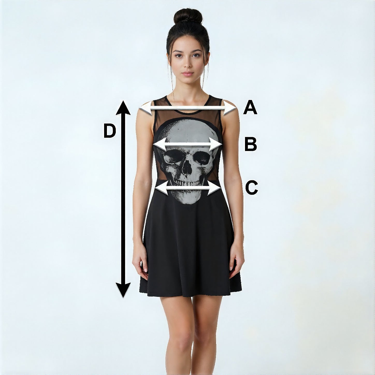 Cette robe noire alternative mise sur une coupe classique équilibrée par un top en dentelle et un crâne frontal affirmé. Le tissu en polyester offre une tenue fluide qui accompagne les mouvements sans rigidité. Le contraste entre la sobriété de la silhouette et le visuel central crée un look à la fois chic et assumé.